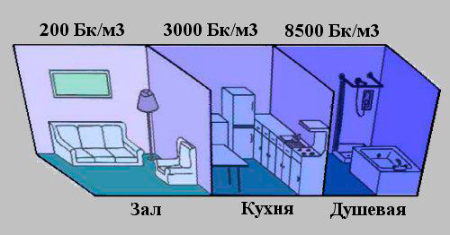 Свойства радона удивительны, его относят к благородным инертным газам, вроде неона или аргона, которые не спешат вступать в реакцию с какими-нибудь веществами. Это тяжелый газ, в сравнении его с воздухом окажется, что он в 7,5 раз тяжелее. Поэтому радон под действием гравитационных сил стремится опуститься ниже воздушной массы. Тот радон, что выделяется из земли, будет скапливаться преимущественно в подвальных помещениях. Газ, выделяемый из строительного материала потолков и стен, будет располагаться на полу этажей зданий. Радон, выделяемый из воды в душевой комнате, сначала будет наполнять весь объем помещения и существовать в виде аэрозоли, затем опустится к нижней поверхности. В кухонных помещениях радон, выделяемый горючим природным газом, в конечном итоге также будет стремиться вниз, оседать на полу и окружающих предметах.