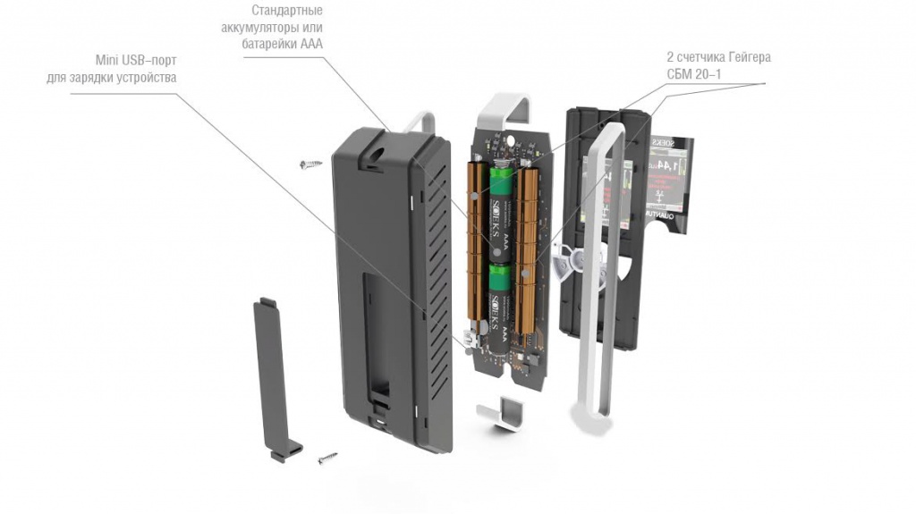 Индикатор радиоактивности Квантум укомплектован фирменными аккумуляторами и зарядным устройством СОЭКС, но также может работать от 2 батареек ААА или от USB-кабеля!