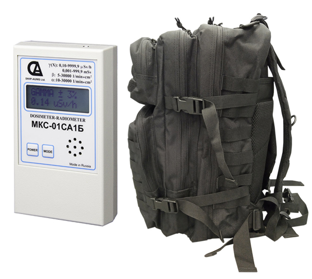 Рюкзак выживания в Ядерной войне. Модификация МКС.Б-тактик имеет отличие: в составе набора находится мульти-чувствительный дозиметр МКС-01СА1Б с относительно высоким пределом измерения радиации до 1,0 Р/ч.